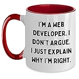 - Calling out all the awesome Web Developers out there! We know the drill - you're not one to argue, but when it comes to explaining why you're right, you're ready to drop some knowledge bombs! Our Web Developer Two Tone Coffee Mug is the perfect way to show off your expertise and unwavering confidence. With its bold quote, "I'm A Web Developer. I Don't Argue. I Just Explain Why I'm Right.," this mug will make a statement wherever you go. It's the ideal gift for any Web Developer who loves a good cup of Joe. Crafted from sturdy ceramic, our Two Tone Coffee Mug is built to withstand the heat of your morning brew and the rigors of daily use. Its 11oz capacity is just the right size for a satisfying dose of caffeine, and the two-tone design adds a touch of style to your desk. Whether you're coding away at work or relaxing at home, this mug is sure to keep you company and remind you of your web-slinging prowess. If you're looking for a unique and thoughtful gift for a special Web Developer in your life, look no further! Our Two Tone Coffee Mug is a great way to show your appreciation for their hard work and dedication. Whether it's Mother's Day, their birthday, or just because, this mug is sure to be a hit. It's a gift that says, "I know you're a Web Developer, and I'm proud of it!" So, what are you waiting for? Order your Web Developer Two Tone Coffee Mug today and let the world know that you're a force to be reckoned with in the world of web development. Your morning coffee will never be the same!