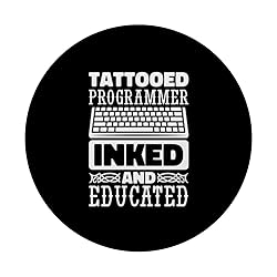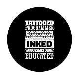 Tattooed Programmer Inked and Educated Great tattooed programmer design for men and women programming. If you are searching for computer coding or computer coder this is for you. Adhesive backing attaches the PopGrip to your case or device. Will not stick to silicone, leather, waterproof, or highly textured cases. Works best with smooth, hard, plastic cases. Not compatible with wireless charging Printed top is swappable with other compatible PopGrip models. Just press flat, turn 90 degrees until you hear a click and remove to swap.
