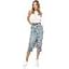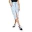 Long denim skirt with a center split and light distressing on the upper pocket area. Traditional 5-pocket construction and zip fly closure. Stretchy, skin tight fit.