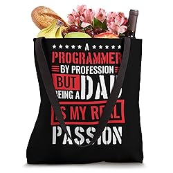 A Programmer By Profession But Being A Dad Is My Real Passion Great programmer dad design for computer programming daddy. If you are searching for computer coder or fathers day this is for you. 16” x 16” bag with two 14” long and 1” wide black cotton webbing strap handles. Made of a lightweight, spun polyester canvas-like fabric. All seams and stress points are double-stitched for durability, and the reinforced bottom flattens to fit more items and hold larger objects. Spot clean/dry clean only.