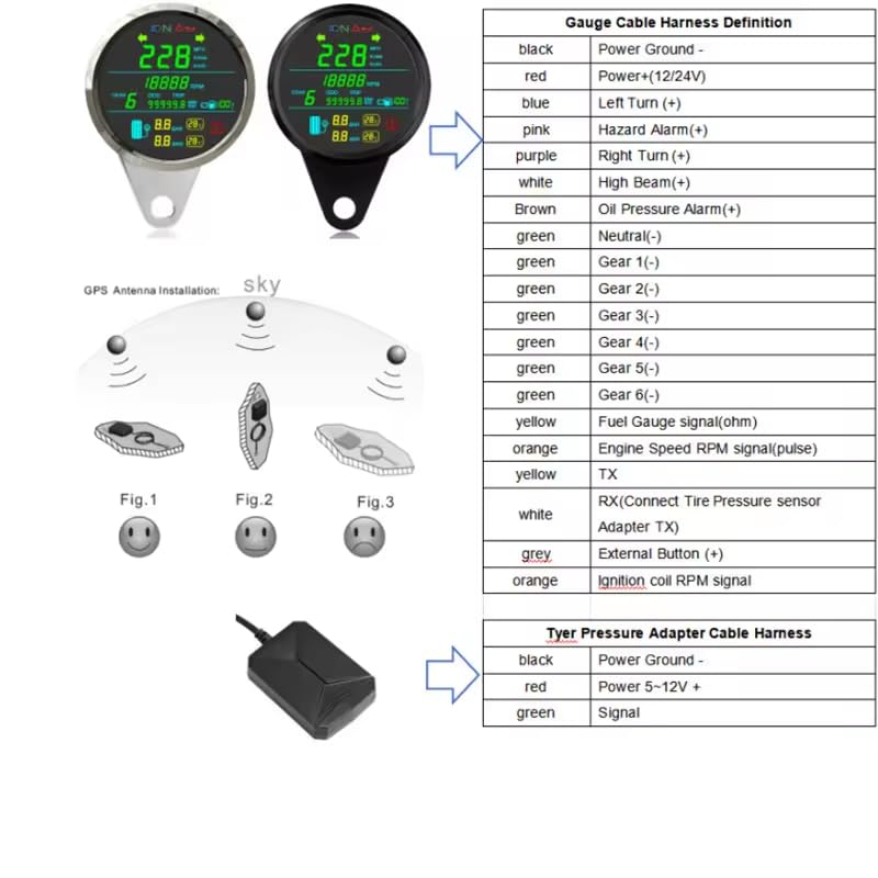 Specification: ● Electronic Speedometer with Unique High Definition and Contrast Ratio LCD ● No Mechanic Sensor, get speed signal from GPS, No GPS Stationary Drift ● Total Mileage Adjustable, Trip Odometer Reset ● GPS Blind Area Odometer Compensation ● Speed Range: 0~299 (MPH, Knots, Km/h) ● Mileage Range: 0-999 999 (Mi,NMI,KM ) ● Trip Odometer Range: 0~999.9 (Mi,NMI,KM ) ● Tachometer Ratio Programmable (support ignition coil connection directly) ● Two Tyer Pressure & Temperature Indicator with alarm ● Gear Number show: N ~ 6 ● Fuel Gauge/ Voltmeter Switch Show ● Indicator: High Beam, Neutral, Alarm, Oil Pressure Alarm, Left Turn, Right Turn ● OverSpeed Buzzer Alarm (Value Adjustable) ● Bezel: Black/Silver 316L Stainless Steel (Anti-Corrosion) ● Reverse polarity protection and anti-fogging performance ● Installation Diameter: 85mm (3 3/8”) ● Working Voltage:12V/24V ● Working temperatures: - 40 to 85°C ● IP67 Waterproof Package Includes: 1x 85MM GPS Speedometer with Tachometer Gauge 1x Wire cable 1x GPS Antenna 1x User Manual