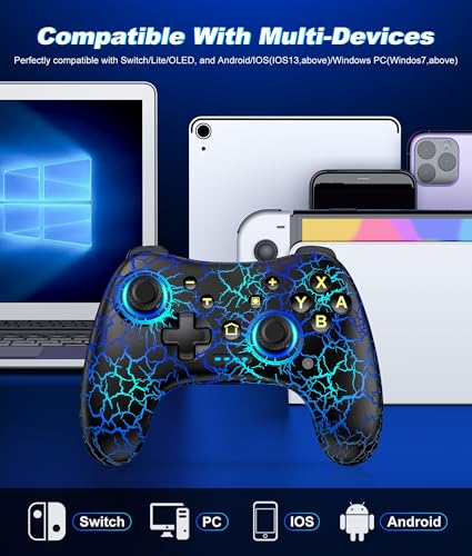 - 【Upgraded Switch Controller】Based before switch controllers we upgraded the wireless switch controller to compatible with Switch Console/iOS/Android/PC(Wired), greatly increasing the types of games that can be played. Switch Pro Controller supports wireless connection to play switch games, iOS MFI games(IOS 13.0 and above), Android HID games; also can be via USB wired connection with PC to support playing X-Input and Steam games.(Windows 7 and above)