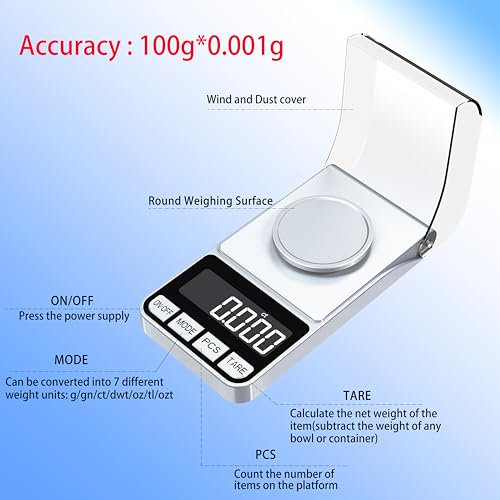 - High Accuracy : This digital scale has 100 gram max weight capacity and reads weights in increments of 0.001g. Min. weight recommendation: 0.005g. High precision sensors make sure the accurate weighing. It also comes with a 50g calibration weight.