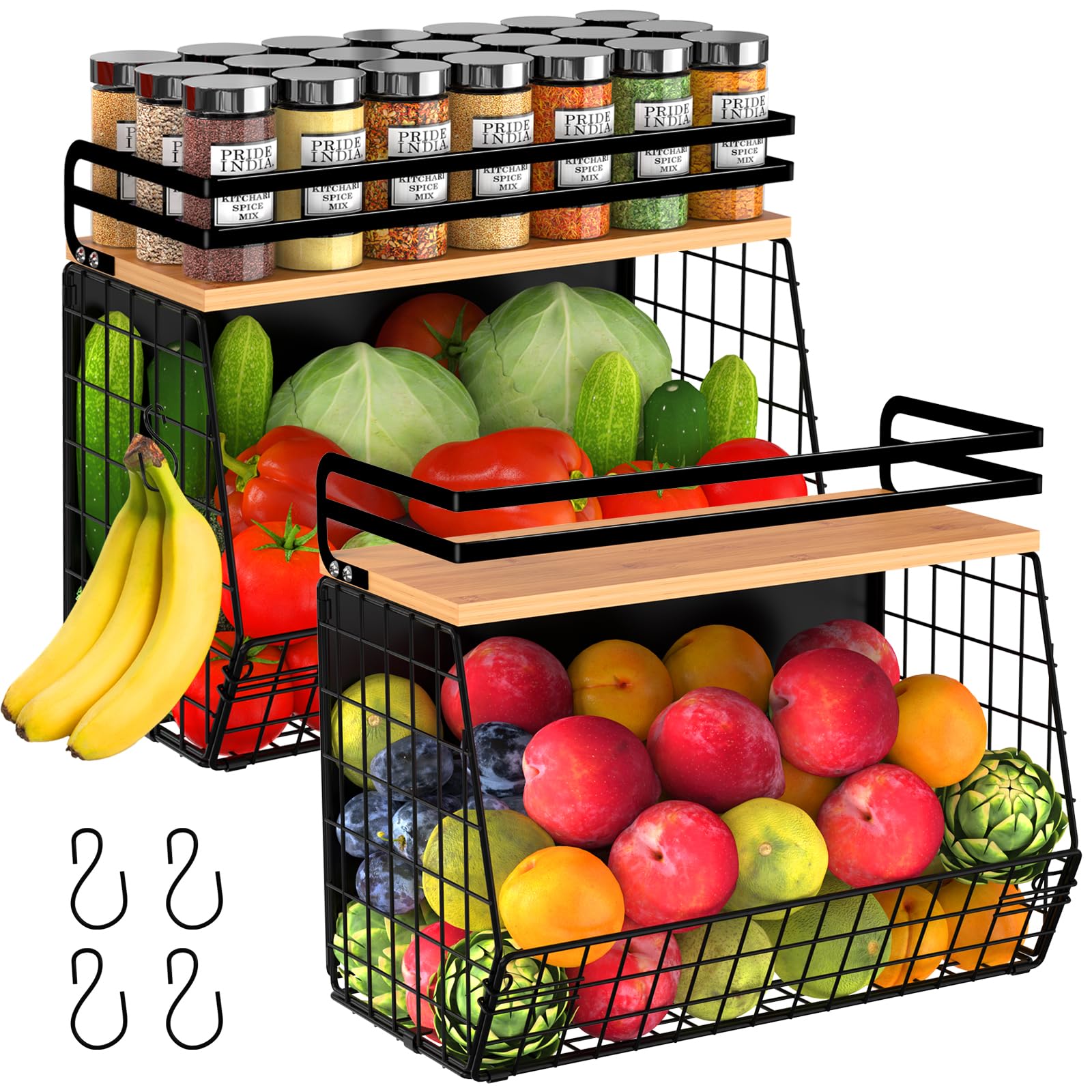 - 【HIGH QUALITY & PRACTICAL DESIGN】1) The upper layer is equipped with natural bamboo boards, which are beautiful and durable, and can easily carry heavy objects such as seasoning bottles, oil bottles, and tableware. 2) Made of thickened high-strength steel. Epoxy coated surface, corrosion resistant and durable. Each shelf has undergone precision processing, with smooth edges and corners. Hollow out design, rust proof and water free, perfect for storing fruits and vegetables (potatoes, onions, tomatoes, etc.) in the kitchen, helping to keep food fresh. 3) Fully enclosed double-layer guardrail enhance safety and prevent item drops