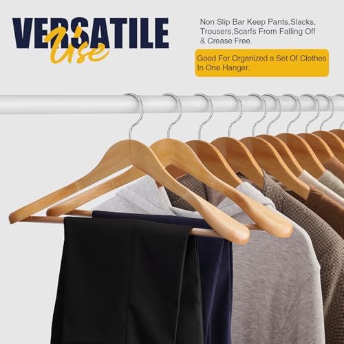 - 【Safe & Versatile Use】Our wood hangers cover with water-based non-toxic paint which is safe for all ages using and all of your clothes like suit,shirt jacket, sweater, bathrobe,and even scarf.It's more sturdy and stable than ordinary wooden hangers, none of burrs and not easy breakage. You can even hang a set of clothes in one hanger, helping you save closet space and make clothes in orderly.