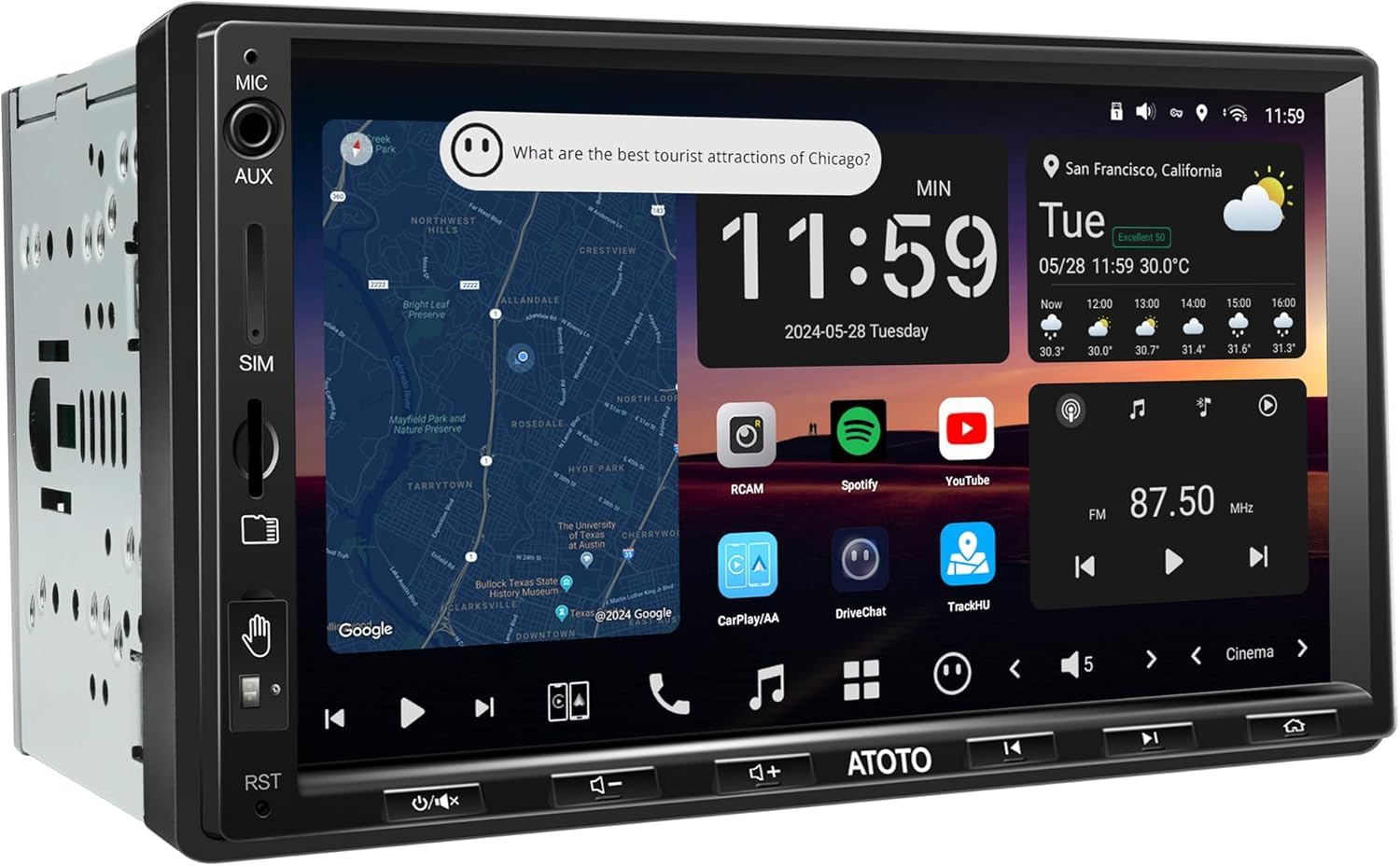 - 【Self-developed Apps】Discover TrackHU app for GPS tracking, featuring up-to-5s updates, accurate 4-satellite positioning, and playback options. Track your trips with detailed reports and stay informed with real-time geofence alerts, available both online and offline. This car play screen also features DriveChat, an ChatGPT CarPlay AI voice assistant akin to ChatGPT PND, for effortless hands-free assistance. Explore additional apps in the FindApps store.