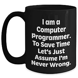 - Calling all Computer Programmers! Looking for a unique gift for that special Computer Programmer in your life? Look no further than our Computer Programmer Black Coffee Mug. Our black coffee mug features the humorous quote "I Am A Computer Programmer. To Save Time Let's Just Assume I'm Never Wrong." This mug is the perfect way to show your appreciation for the hard-working Computer Programmer in your life. Whether they're just starting out or have been coding for years, this mug is sure to make them smile. This mug is made of high-quality ceramic and is both microwave and dishwasher safe. It's also available in two sizes: 11oz and 15oz. So whether you're looking for a gift for Father's Day, a birthday, or just because, our Computer Programmer Black Coffee Mug is the perfect choice. Show your favorite Computer Programmer how much you care with this funny and functional gift. Don't miss out today!