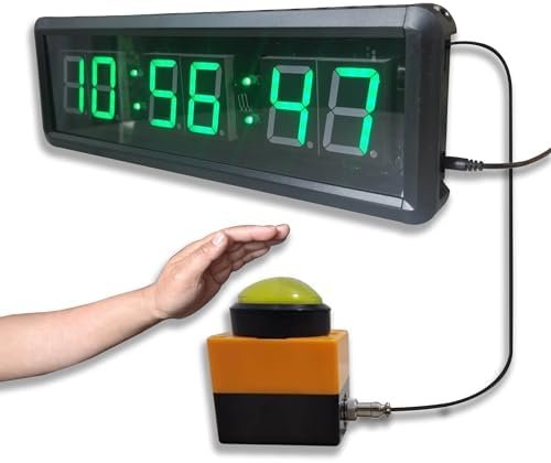 This countdown clock features stopwatch, count up, countdown, and real-time functions, meeting your timing needs in various occasions. There is a cable that comes out from the clock and the other end can be easily plugged-in the 6cm diameter button base. You can easily start, stop or reset your clock timing by a gental tap on the big button. Functions Real time clock - support 12/24 hour time display in hours minutes seconds format. Countdown - Max count up to 99 hours 59 miniutes 59 seconds. You can program a countdown timing from anytime and count down to 00:00:00. Big button can control this countdown timing. Count up - Maxt count up to 99 hours 59 miniutes 59 seconds. You can start your count up timing from 00:00:00 and stop at any time you program. Big button can control this countdown timing. Stopwatch - It runs in minutes seconds and 1/100 second. Max count up to 99:59:99. Big button can control this countdown timing. The product uses a 1.5-inch ultrabright high green characters that makes it easy to read time wherever you are, attracting attention and igniting your competitive spirit. The product measures only 13.4x3.7 inches in size, making it portable for any venue. Clap & Remote Control! Large Digital Stopwatch Timer with Remote & Hand-Slap Button – Perfect for Gym, Game, Home & Workouts Take command of time with our versatile Large Digital Stopwatch Timer! Featuring a brilliant high-visibility green LED display, this all-in-one clock effortlessly handles countdown, count-up, stopwatch, and standard time keeping clock. Perfect for high-energy workouts, competitive exercise sessions, home games, meetings, or any timed activity. Why You'll Love It: ✅ Clap-to-Control Simplicity: Smack the 6cm slap button (connected via a 5ft cable) to start, stop, and reset timing instantly. No fumbling – perfect for sweaty gym sessions or fast-paced games! ✅ Remote Convenience: Switch between clock, count-up, countdown, or stopwatch modes from up to 30 yards away with the included remote. ✅ Crystal-Clear Visibility: The extra-large green digital display is razor-sharp indoors (visible up to 20 yards). Designed for quick glances mid-workout. ✅ Built Tough: Aircraft-grade aluminum shell and double-layer PCB panel ensure durability, stability, and protection against drops or travel bumps. ✅ Flexible Setup: Wall-mount it in your gym or place it on a desk. Powered by included AC adapter (100-240V) or any USB power bank (not included). Ideal For: Backyard Games, Shuttle/Sprint Runs, Exams, Presentations, Kitchen Timers, Home Exercises, Workshops, Workouts, Competitions, PE Tests, etc. Anywhere you need reliable, large-format timing! Premium Features: Multiple Functions: This large digital countdown clock stopwatch timer offers a clock, countdown, stopwatch, and count up timer functions, making it perfect for a variety of activities. User-Friendly Design: With a 6cm diameter button and a 1.5-meter-long data cable, you can easily start, stop, and reset the timer with a simple tap. The remote control allows you to switch between functions effortlessly. Durable and Portable: The aluminum alloy casing with exterior baking paint ensures durability and easy portability. It's lightweight at 0.65kg and can be wall-mounted or placed on a desktop. High-Quality Display: The high-brightness green LED display ensures clear visibility, even in bright conditions. With a lifespan of over 60,000 hours and low power consumption, it's an eco-friendly choice. Note: For best results outdoors, set timers indoors first or stay within 10 yards of the unit. Bright sunlight may reduce remote range and display visibility.
