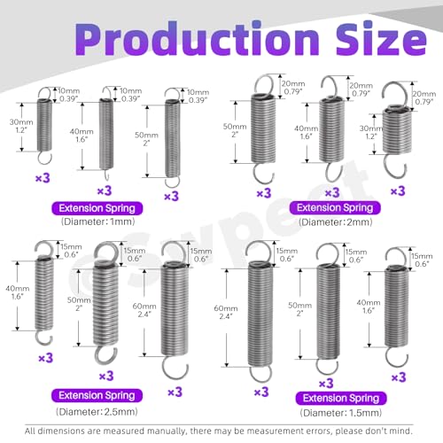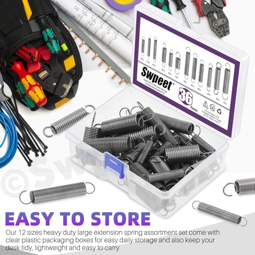 💯 Swpeet 36Pcs 12 Different Sizes Carbon Steel Extension Spring Assortment Kit, Extended Tension Spring Wire Dia 0.039" 0.059" 0.078" 0.1", OD 0.39" 0.59" 0.78", Length 1.18" 1.57" 1.96" 2.36" 💯 Why Choose Us? 💢 1, Quality Material 🥇 Nickel-Plated wire Which can not rust in humid environment and have strong oxidation resistance, acid resistance and corrosion resistance. Good springs, effective, and as described. Check specs first. These are easy to recommend! 🌱 2, So Many Different Sizes 🥇 We have prepared 12 sizes of springs for you, you only need to buy them once, which saves your time and energy. This kit had a selection of lengths and diameters that allowed to test fit different options. 🌱 3, Trustworthy 🥇 Professional design, rigorous calculation, precise manufacturing and effective testing. There they were! Just what you are looking for! Even with an assortment of different sizes! 🌱 4, With a Container 🥇 For your storage and storage convenience, we have carefully prepared a packing box for you. 💯 Specifications: 🥇 Color: As shown in the picture 🥇 QTY: 36Pcs 🥇 Material: Carbon Steel 💯 Package Included: 💫【0.039 x 0.39 x 1.18"】------------ 3Pcs 💫【 0.039" x 0.39 x 1.57" 】------------ 3Pcs 💫【 0.039 x 0.39 x 1.96" 】------------ 3Pcs 💫【 0.059 x 0.59 x 1.57" 】------------ 3Pcs 💫【 0.059 x 0.59 x 1.96" 】------------ 3Pcs 💫【 0.059 x 0.59 x 2.36" 】------------ 3Pcs 💫【 0.078 x 0.78 x 1.18" 】------------ 3Pcs 💫【 0.078 x 0.78 x 1.57" 】------------ 3Pcs 💫【 0.078 x 0.78 x 1.96" 】------------ 3Pcs 💫【 0.098 x 0.59 x 1.57" 】------------ 3Pcs 💫【 0.098 x 0.59 x 1.96" 】------------ 3Pcs 💫【 0.098 x 0.59 x 2.36" 】------------ 3Pcs 💫 Intotal 36Pcs