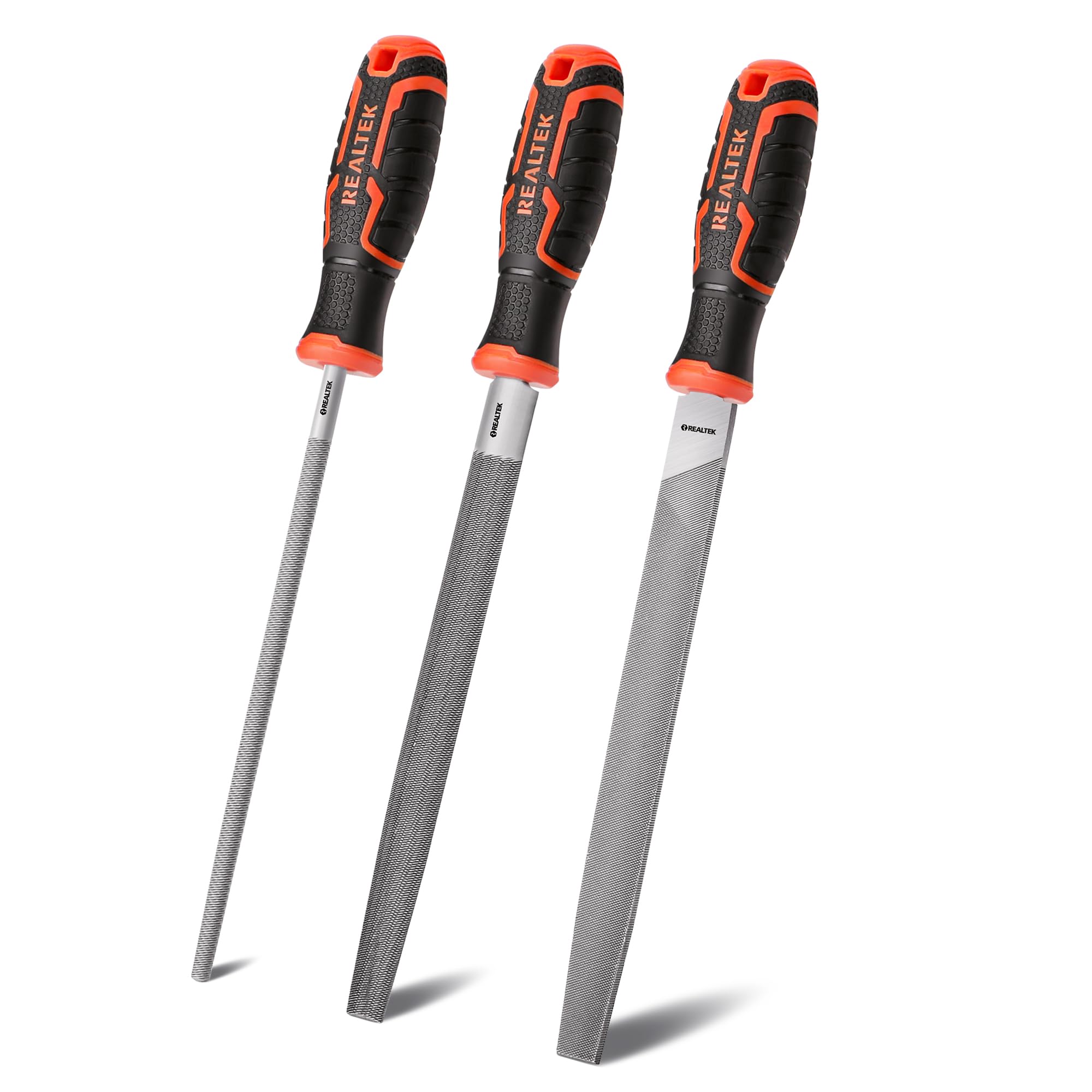 REALTEK 3-Piece 12" Wood Rasp File Set with 4" Longer Rubber Grip, T12 High Carbon Wood File Set for Woodworking, Flat/Half Round/Round Perfect Files for Wood Manual Cutting and Sharping