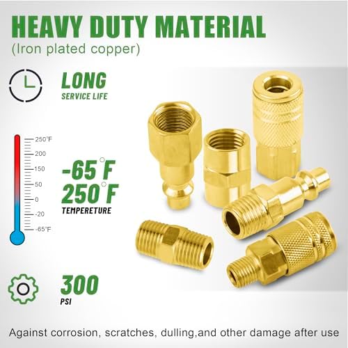 - PREMIUM MATERIAL: Our air hose fittings are made of iron(except for the hex coupler and nipple, they are made of brass), and a layer of copper is plated outside the fittings to improve corrosion resistance and extend the service life, ensuring exceptional durability and reliability even in heavy-duty applications