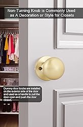 Non-Turning Pull Design: This dummy door knob is a non-functional style used only as a pull or handle, perfect for closet doors, pantry doors, or French doors. Each pack includes 2 knobs, and it’s important to note these do not turn or lock Durable & Long-Lasting: Crafted with sturdy metal construction, these dummy door handles are built to resist daily wear and tear, maintaining both strength and stability over years of use Easy to Install: The gold dummy door knob requires no latch or lock mechanism and installs quickly with just screws, making it a simple upgrade for homeowners Classic & Modern Style: Designed to complement various home decors, these dummy door knobs feature a timeless gold finish that looks sleek and versatile in any room Perfect for Replacements: Whether used as a closet door knob or one sided door knob, the wide base plate covers old lock marks completely, offering a clean and stylish update