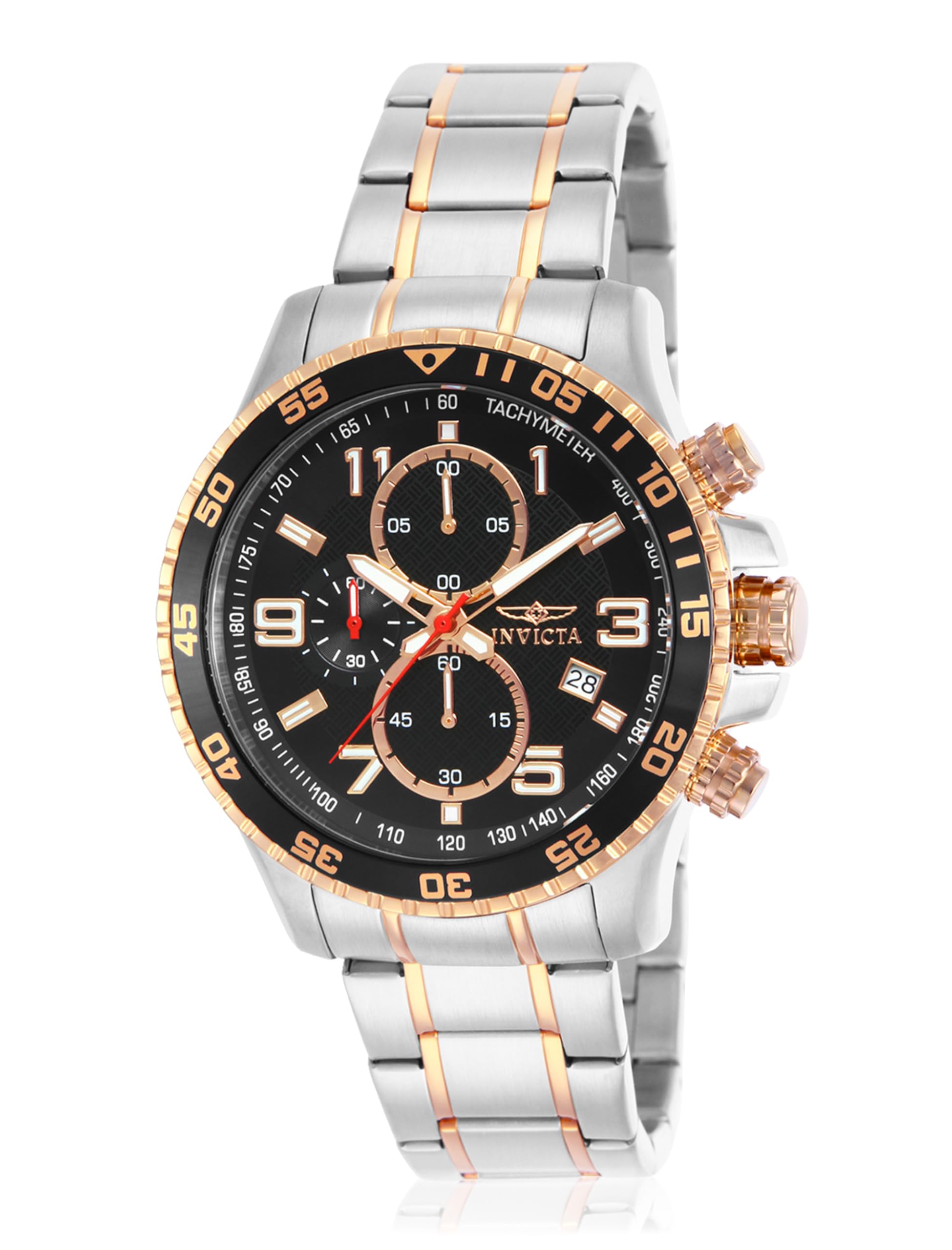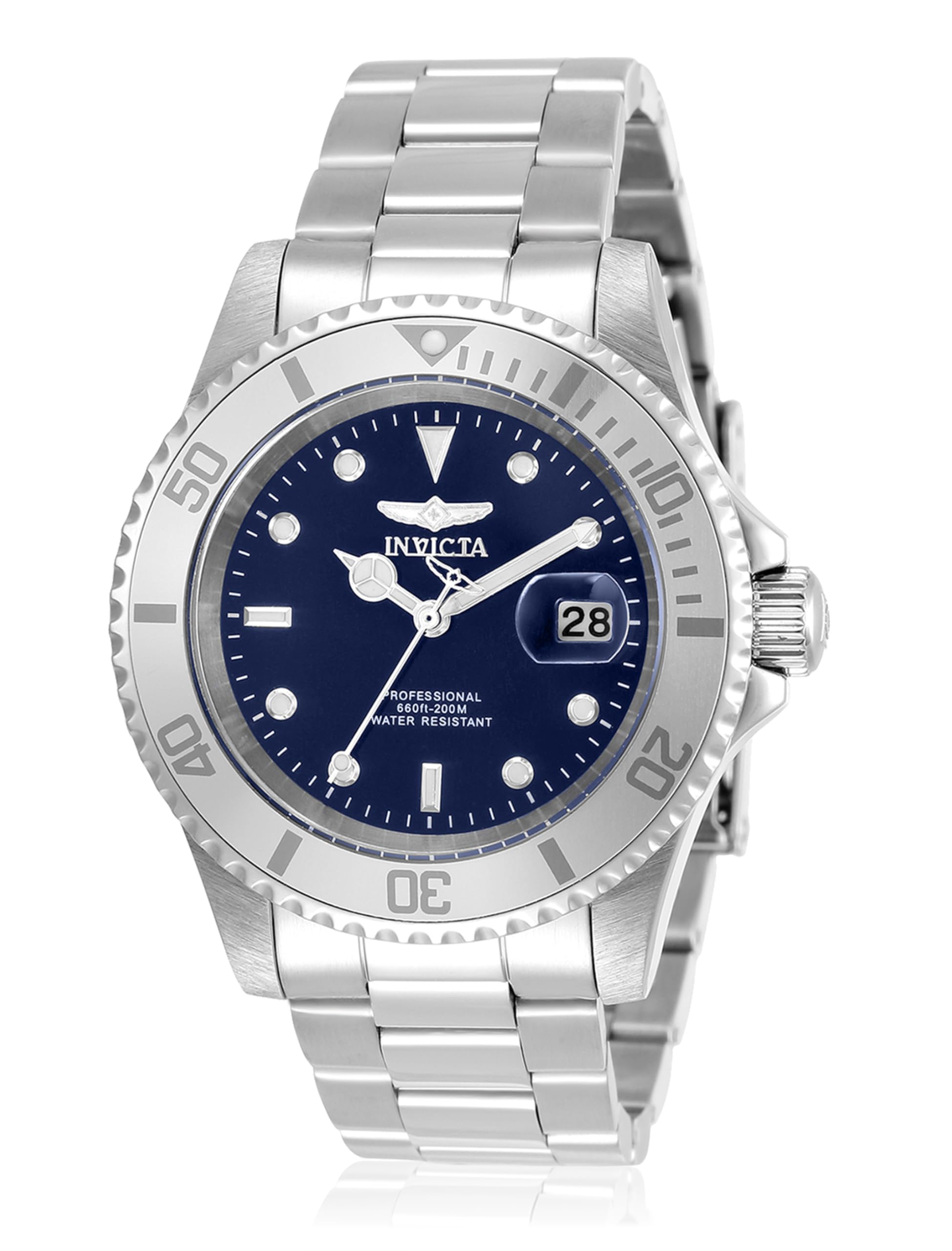 Black dial enhanced by silver-tone hands. Silver-tone stainless steel case with a silver-tone stainless steel band. Automatic movement. 300 meters / 1000 feet water resistance. Uni-directional Rotating bezel. Scratch Resistant Mineral crystal. Transparent See Through caseback. Fold over safety clasp. Screw Down crown. Case size 47 mm x 17 mm. Band 22 mm x 8.25 incheslong. Invicta 47296 Pro Diver Watch.