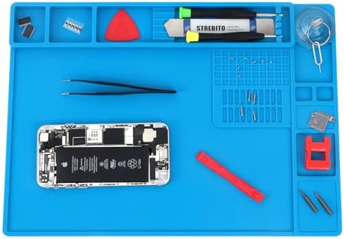 - Organized & Efficient: The STREBITO soldering mat features 7 accessory zones, 1 tool zone, 3 magnetic areas, and 70 compartments for screws, small parts, and tools. This silicone soldering mat keeps your work bench tidy, preventing items from rolling or getting lost. Easy-access compartments save you time and make soldering and reassembly quick and hassle-free