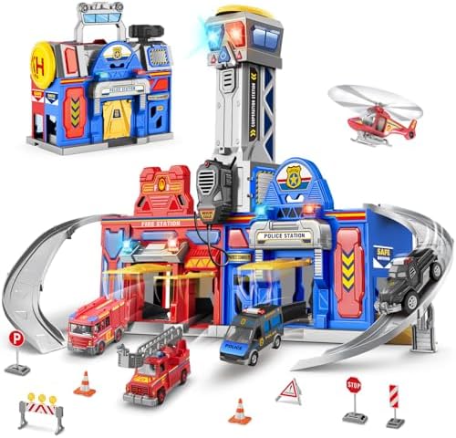 Ochido Boys Toys for 3 4 5 6 Years Old,Large City Action Playset Kit with Lights Sounds,Walkie-Talkie,Foldable Police & Fire Station Transform Track Toy with 4 Cars,Helicopter,7 Accessories