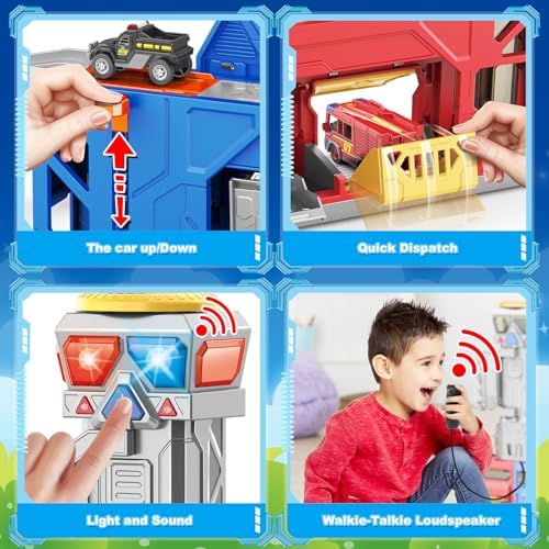 - Large City Action Toddler Playset:Our toddler playset can transform into a police station and fire station, including elevators, tracks, garages,and iookout tower has realistic sounds and lights, plus a walkie-talkie. The walkie-talkie to give instructions to initiate a rescue operation, feature realistic details. Which helps kids learn more about rescue operation,and stimulate their's imagination and creativity.