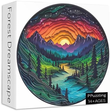 - Vibrant Magic Forest Paper Cut Art Puzzles: This is a unique round puzzles for adults 1000 pieces paper cut style. It depicts the landscape of mountains and rivers under a dreamy forest. The starry rainbow gradient sky and the majestic mountains and rivers intersect together to present a dreamy and magnificent landscape