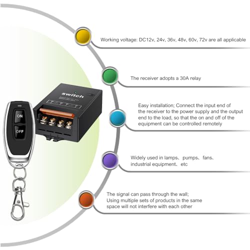 • Wide voltage high-power: 12v wireless remote switch built-in 40a relay,Current Rating 30A;Suitable for high-power equipment,Working for DC12v 24v 36v 48v 60v 72v