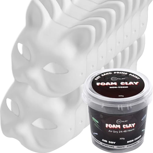 CALPALMY 300G AirDry Clay Black Moldable Foam Clay with 16 Packs White Blank Cat Mask for Party, Cosplay, Artistic Projects