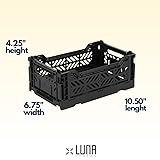 - Luna Crates will help you get organized in style. Made of recyclable plastic, this 3-pack of folding baskets is kind to the environment while also being durable and versatile. Each crate measures 5.75" H x 11.80" W x 15.75" D, allowing you to neatly store toys, books, blankets and more throughout your living space. When not in use, the crates fold down flat to take up minimal space. Use them under the coffee table to corral remotes and magazines, in the bedroom to hold folded clothes or blankets, or in the kitchen as a recyclables bin. Colors adds a pop of personality wherever you place them. Say goodbye to clutter and hello to a tidy home with this set of practical yet playful plastic storage crates.