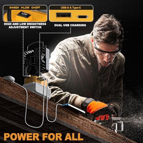 - ROTATABLE & CHARGING - The cordless outdoor lights has 140° rotatable design. It can adapt to different work scenarios and lighting needs in different directions. It also has a USB-A & USB-C charging port, which can be used as a power bank to charge your mobile phone, headsets, tablets, speakers or other devices while working. It's a great led work light option for 20v battery tool bag or box