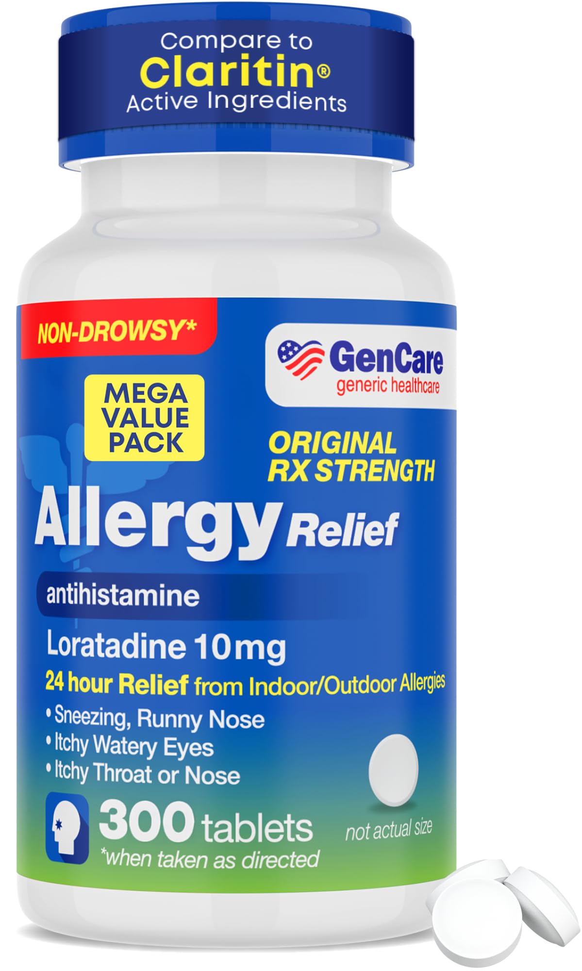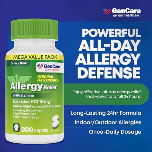 GenCare - Cetirizine HCL 10 mg (300 Caplets) - 24 Hour Allergy Relief Pills - Non Drowsy Generic OTC Allergy Medication - Antihistamine Medicine for Sneezing, Runny Nose & Itchy Eyes - Generic Zyrtc