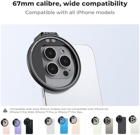 - 【Amplia Compatibilidad】El clip se puede sujetar a la mayoría de los teléfonos inteligentes para tomar videos como una cámara réflex profesional. El clip de lente para teléfono de 67 mm es compatible con cualquier filtro magnético, incluyendo filtros CPL polarizadores y de protección UV, filtros de densidad neutra, así como filtros de efecto como LPR, GND, estrella de rayos, difusión negra, rayo azul/oro y más filtros DSLR. El filtro CPL de 67 mm también puede funcionar con cámaras con hilo de lente ø 67 mm (se requiere un anillo adaptador magnético para la lente de la cámara)