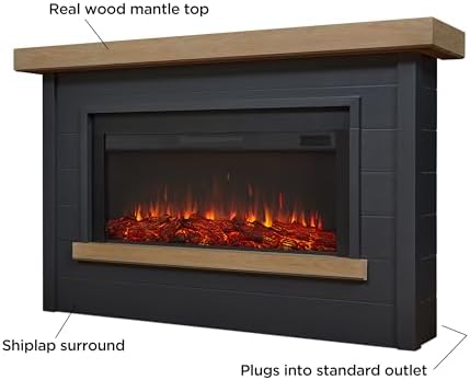 - Includes: Mantel, replaceable electric fireplace heater insert, remote control, 6 foot power cord with lay-flat plug, anti-topple safety device and hardware. One year limited warranty. Assembly required.