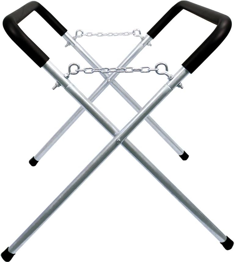 Work stand has foam cushions to reduce slipping of bumpers, doors, fenders, or hoods and guards them against scratches. The portable stand has non-skid feet to keep it balanced and positioned. Constructed of light yet durable zinc-plated steel, this work stand supports body panels, doors, and other parts up to 500 lbs.