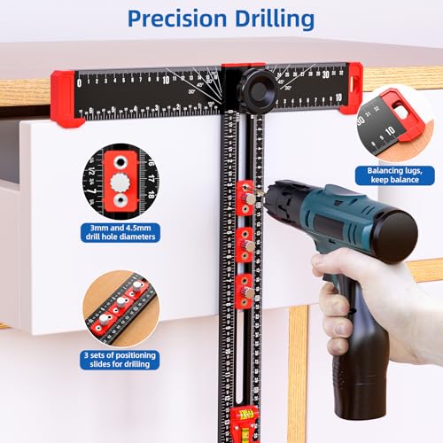- 【PRECISION HOLE PUNCHING】This drilling and positioning T square is equipped with 3 sets of sliders dedicated to locating and punching holes, you can adjust the sliders to accurately locate the punched holes and use it to punch holes directly, which is suitable for punching and installing knobs and pulls on cabinets, drawers, doors, and other furniture.woodworking tools