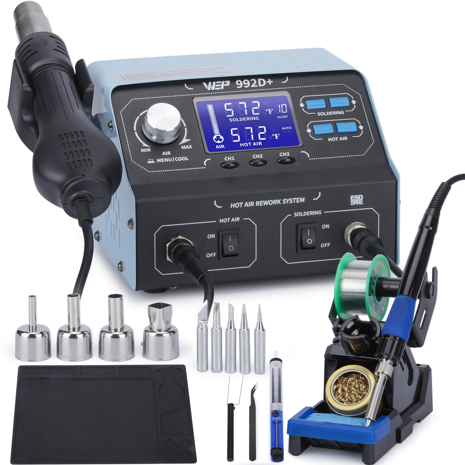 WEP 982D-II 2-In-1 Micro Soldering Kit with Type-210 and 245 Micro Soldering Iron; Automatic Calibration, Adaptive Display Mode, 3 Pre-set Channels, Dynamic LCD Display, Automatic Sleep Mode and More