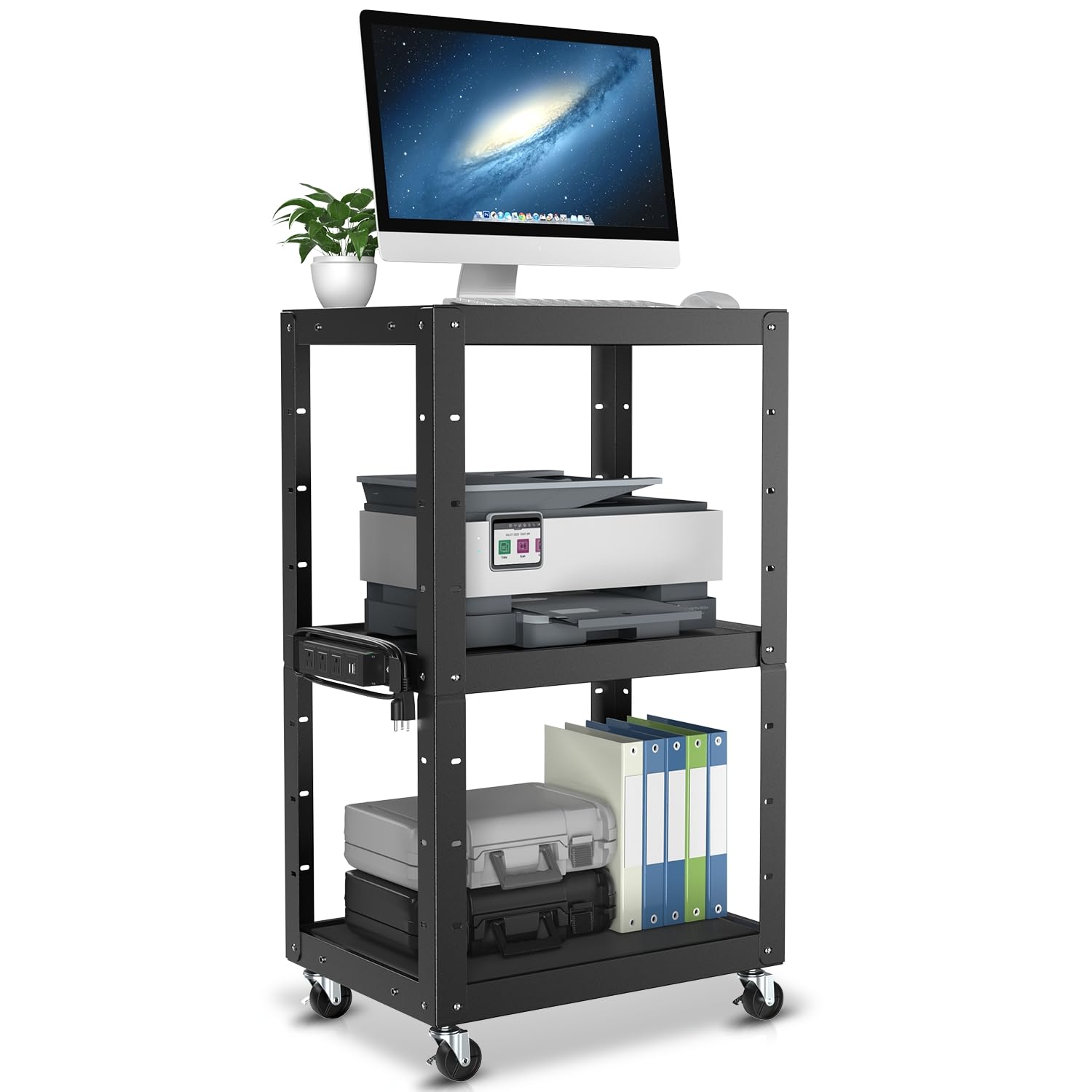 AV Cart, Black Metal AV Cart with Adjustable Height, Locking Cabinet, Pull Out Keyboard Tray and Power Cord Management for TV Display Stand and Video Projectors
