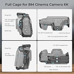 Basic Cage Kit for BMCC 6K: SmallRig 4574 comprises a cage, a lens mount adapter support, a top handle for ARRI-style, an SSD mount bracket, and a clamp for HDMI/USB-C cable. Please note: The cage is exclusively designed for BMCC 6K, NOT for BMPCC 6K or 6K Pro. Full Cage to Half Cage Convertible: SmallRig 4574 is designed to provide creators with a comfortable low-angle shooting experience, protect the camera, and offer multiple accessory expansion options. This included full cage designed specifically for Blackmagic Design Cinema 6K can be transform from full cage to half cage for enhanced versatility, making it easier to balance when used with a stabilizer. Three-Point Locking System: Three-point locking system secures the camera via two 1/4"-20 screws at the base and a 1/4"-20 screw on the top, while integrated silicone pads prevent scratching. The cage provides unobstructed access to all camera interfaces, card slots, the flip screen, and the battery compartment. Versatile Mounting Options: Constructed from protective aluminum alloy, this cage features 1/4"-20 threaded holes, 3/8"-16 threaded holes, locating holes for ARRI, cold shoe mounts, NATO rail, QD mounts, the kit accommodates SmallRig accessories such as Monitor Mount 2903, Side Handle 4015, NATO Side Handle 3847, Baseplate 3357, LED Video Light 3286, Microphone 3468, Rod Clamps and more. Top Handle, SSD Mount Bracket: The ergonomic top handle for ARRI-type offers creators a comfortable low-angle shooting experience, facilitating camera operation. Additionally, the included SSD mount bracket with a built-in cold shoe mount allows for quick assembly and disassembly, compatible for Samsung T5/T7 SSDs. Secure Lens Mount Protection & Signal Transmission: The lens adapter support is compatible for Sigma MC-31, for Sigma MC-21, and similar adapters, safeguarding the camera mount from damage. The kit also includes a clamp for HDMI & USB-C cable to protect the camera ports and prevent signal loss during transmission.