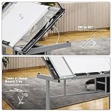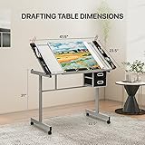- Designed for artists and designers, this drafting table features a sturdy steel frame and easy-to-use adjustment mechanism to provide users with a convenient, more creative workspace.Multifunctional Drawing Table: This drawing table not only can be used as a drawing table, computer table and writing desk in daily life, but also widely used in various creations, art painting or work occasions.0-65° Tilting Angle: The desktop angle of the drawing table is adjustable, and the tilt range is between 0-65°. It can be adjusted according to different needs during use.Sturdy Construction: The surface of the metal stand of this art table has an anti-rust coating, with a transparent tempered glass table top. It is waterproof, rust-proof and shatter-proof, sturdy and durable, and has a long service life.Removable Plastic Trays: 4 embedded stationery trays on both sides can be freely arranged, several honeycomb pen holes and slots in different sizes on the trays help organize stationery and tools. Two non-woven fabric drawers on the right can be pulled out silently.Drafting Table with 4 Rolling Casters: This is a portable drawing table with four wheels that can rotate 360° flexibly, two of which can be locked freely. Additionally, there are four rubber feet to provide anti-slip and floor protection functions.