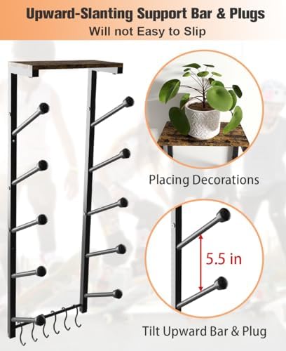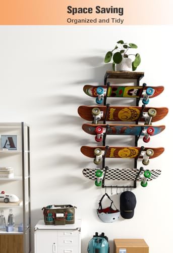 - 【LARGE CAPACITY & SPACE-SAVING】The wall-mounted skateboard rack holds up to 5 skateboards, offering ample storage while saving space. It includes a top shelf and 6 bottom hooks for storing additional skateboard gear like helmets, pads, backpacks, shoes, and gloves. This makes it a stylish addition to living spaces, bedrooms, and garages, keeping everything organized and tidy.