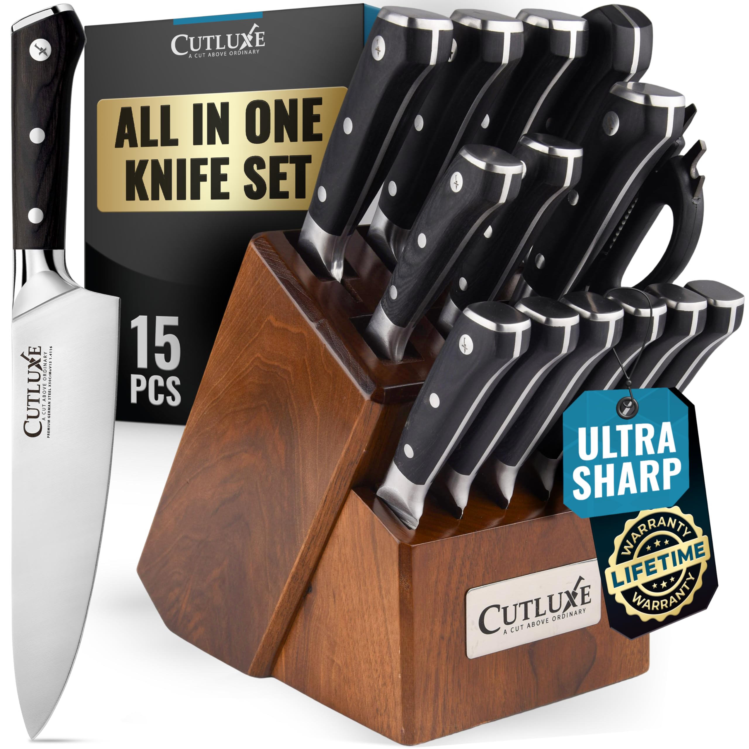 - COMPLETE SET: This 15-piece kitchen knife set includes: 8” Chef, 7” Santoku, 8” Bread, 8” Carving, 5.5” Utility, 4” Paring, 6 x 5" Serrated Steak knives, detachable Kitchen Shears, and a Honing Rod, in a natural Walnut Wood Block.