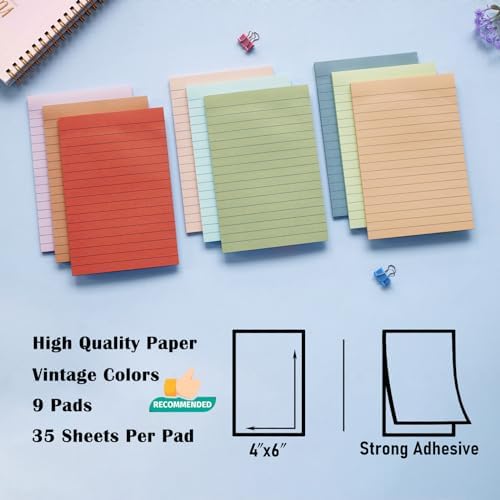 - Vintage Colorful Lined Sticky Notes: 9 pads Sticky notes 4x6 contains 9 vintage aesthetic colors. The beautiful lined sticky notes keep important information from going unnoticed, add flair to your everyday life. Very practical!