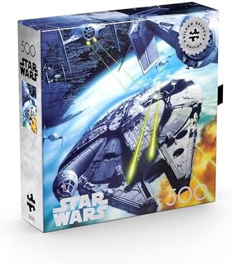 This 500-piece Star Wars™ Silver Select Puzzle is created for the Star Wars™ fan. It features the Millennium Falcon in an intense space battle with Darth Vader and his fleet of TIE Fighters, as it tries to escape the menacing Death Star. The Silver Select puzzles are curated and timeless images from The Walt Disney Company, Lucasfilm, and more. They are packaged in a giftable box with silver foil accents, use premium recycled puzzle board, and include a full-color diagram. Every Buffalo Games jigsaw puzzle is manufactured from recycled puzzle board. A precision cutting technique guarantees that every piece will fit soundly with the company's signature Perfect Snap™. A bonus puzzle poster is also included so that you have a handy reference of what the completed puzzle should look like while you put yours together. © & ™ Lucasfilm Ltd.