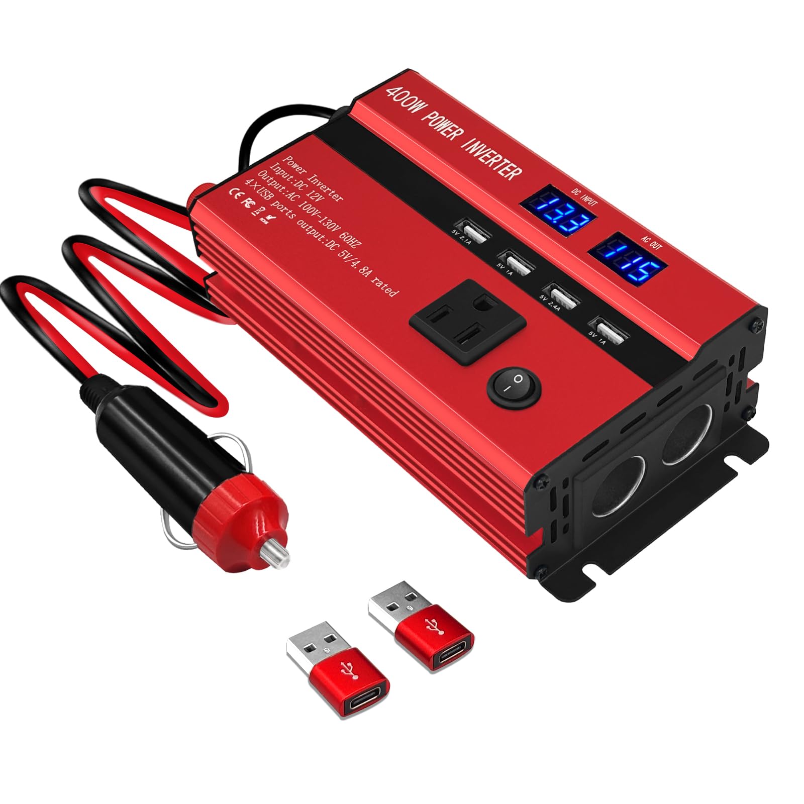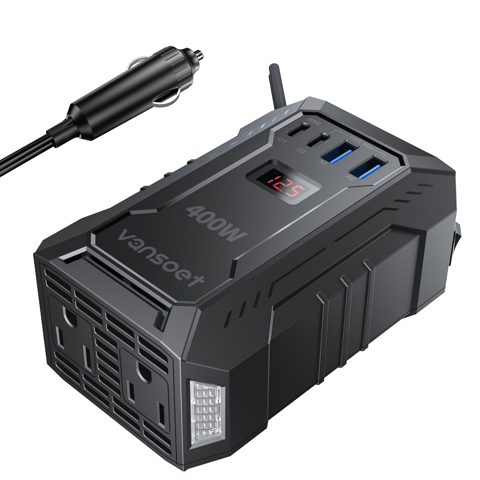 - 【4-in-1 Car Power Inverter】The 400W Power Inverter features 2 AC outlets, 1 USB-C port (Max 65W), and 1 USB-A port (Max 18W), which can provide 400 watts continuous DC to AC power and 800 watts of peak power, allowing you to charge multiple devices simultaneously, making it ideal for use in driving, road trips, or while camping.