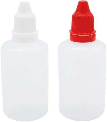 Applications: Designed for travel and can be used to dispense and store most liquids. Great for solvents, light oils, glue, paint, essence, liquid, juice, eye drops, saline, alcohol, etc. Dropper can be well controlled liquid dripping, the small needle tip can control the flow of liquid easily, can be removable when you do not need it. Specification: Material:Plastic, Size:Diameter 37 mm (~1.46 inch), Height including lid 92 mm (~3.6 inch) Capacity:50ml/1.7oz. Package Including: 2Pcs plastic dropper bottle empty (translucent bottle body with white lid+red lid). Note: Cannot be used for corrosive liquid, strong acid, and alkali liquid.