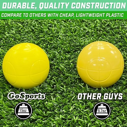 - PREMIUM COMPOSITE CONSTRUCTION: Crafted from high-grade composite plastic for long lasting durability; The 90 mm diameter balls weigh approximately 15 oz each, closer to regulation bocce than lightweight sets that are nothing like real bocce