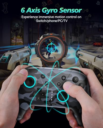 - 6-Axis Gyro Sensor: This wireless game controller utilize 6-axis motion controls for aiming and other movements on Switch, mobile, PC, or TV games