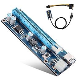 - Specification: Description: This product is specially designed for mining, aiming at solve the problem of burning wire. It adopts 4 solid-state capacitors, making graphics card power supply more stable and secure. And 6pin interface on the graphics card, can strengthen power supply, and reduce the burden of the motherboard while connecting multi-graphics card. Features: 1. Adopt 4 solid-state capacitors, making graphics card power supply more stable and secure. 2. 6pin interface on the graphics card, can strengthen DC-DC power supply, graphics card independent from the motherboard, and reduce the burden of the motherboard while connecting multi-graphics card. 3. Graphics card slot adopts original imported connector for good contact. 4. USB cable is relatively soft, easy to track, and you can put the graphics card as your will. 5. Due to slot equipped with a fixed buckle, it is easy to remove or fix graphics card, and the graphics card will not fall off from the slot. 6. Power supply cable made of thick pure copper core can avoid burning wire when mining. Specifications: Name: Mini PCI-E to 16x 6-pin Power Supply Interface Line Length: 0.6M / 23.62inch Interface: Mini PCI-E, PCI-E 16x Supported System: Compatible for all os, LINUX USB Cable Color: Black Package Style: PE bag Package Weight: 82g Package List: 1 x Mini PCI-E 16x Adapter 1 x PCI-E 1x Riser Board 1 x USB Cable 1 x SATA 15Pin-6Pin Power Cable Note: Because of the difference of production batch, the color of slot buckle and capacitors may be a little different, which will not affect its function. Please kindly know it before purchase. Please note that the new type and old type of this product will be sent randomly, and sure you will not mind before ordering.