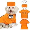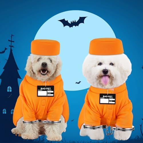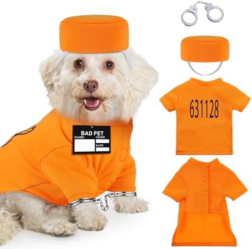 - Complete Package Dog Halloween Costume: this innovative package contains everything you need to transform your pup into a hilarious Halloween sight with its prisoner outfit theme; It comes with a cotton made orange pullover L size with measurements of 15.35" back, 19.29" chest, and 15.35" neck, an adjustable prison hat, a bad dog sign card 3.15 x 4.72 inches, and plastic handcuffs, promising a memorable Halloween and a fantastic addition to your dog's costume collection