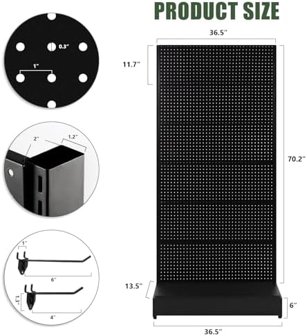 - Firm Construction: This peg board display stand is very sturdy, the frame is made of thicker Iron, heavy duty, and the pegboard thickness is 0.6MM, more strong and durable. So it can hold heavy items such as house wares/sports equipment/clothing and so on; the other the bottom plate can store more products for you.