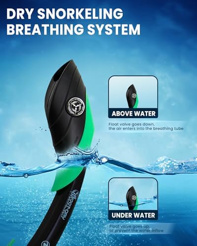 - Dry Top Snorkel: The top of snorkel is equipped with a one-way purge valve, allowing you to blow out any water in the snorkel with ease. The valve can be sealed to prevent water from entering when underwater, and can be opened to allow you to breathe easily when above water. It is friendly to new beginners