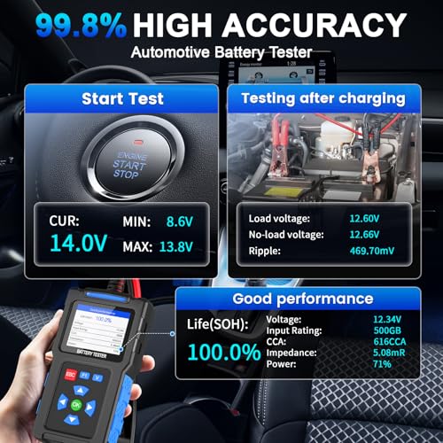 - Accurate Battery & Alternator Diagnosis: Equipped with intelligent chips, TopDiag 12v battery tester BT300 delivers reliable results for battery health (SOH), charge status (SOC), CCA, and impedance. No more guesswork—select the correct battery type/CCA value, and get precise data in 10 seconds (Note: input correct AH value for quick test, or use standard test for no manual input).