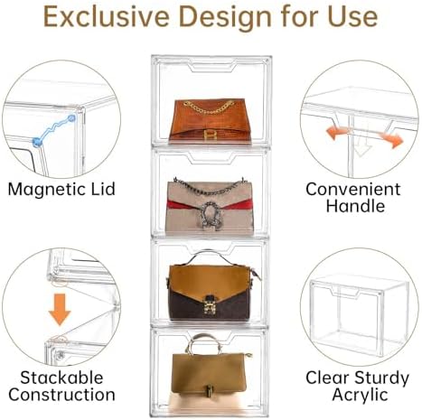 - Stackable Slots Design:The top and side of the acrylic box feature two small slots, which can be used for connecting and fixing multiple acrylic boxes. This design allows multiple storage bins with lids to be combined into a single storage cabinet or display wall.The stackable storage bins are perfect for storing a variety of handbags and doubles as a display case for anime collectibles and room decor, enhancing your home's aesthetics. They can also be used for cosmetics, clothing, and other household items.