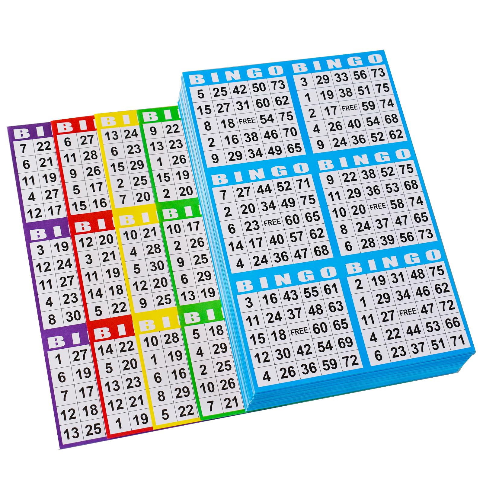 - This bingo card set comes with 5 colors of cards, and the bingo sheets are glued together in the following order: starting with the top bingo sheet, the colors are blue, red, green, yellow, and purple.