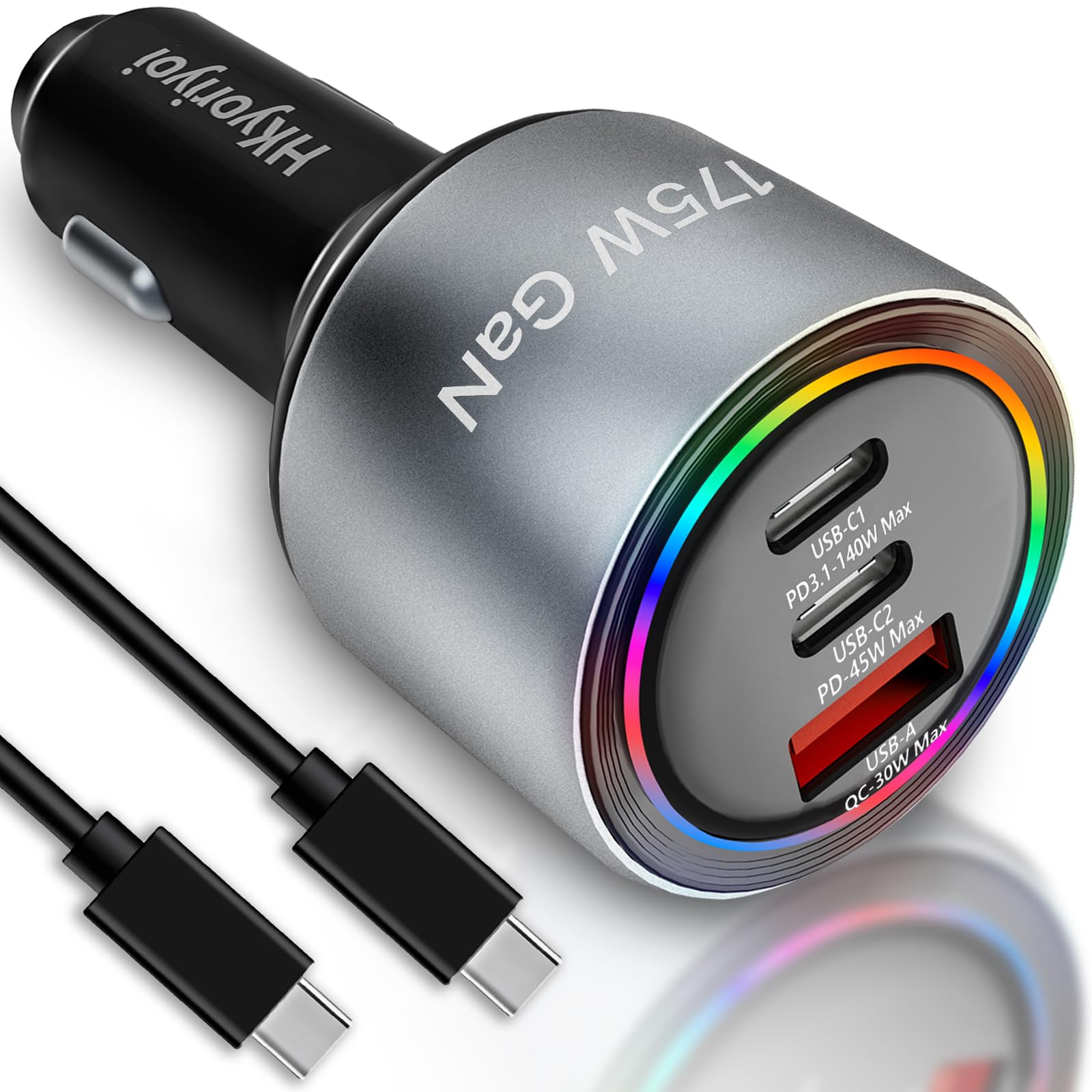 - Meet your ultimate travel companion: This 175W USB C car charger, equipped with a 140W USB-C port (C1) for laptops, a 45W USB-C (C2), and a 30W USB-A port, it delivers super fast charging to all your devices at once. With three independent fast-charging protocol chips, each port operates without interference, so you get max speed across all devices simultaneously, with no power sharing or slowdowns